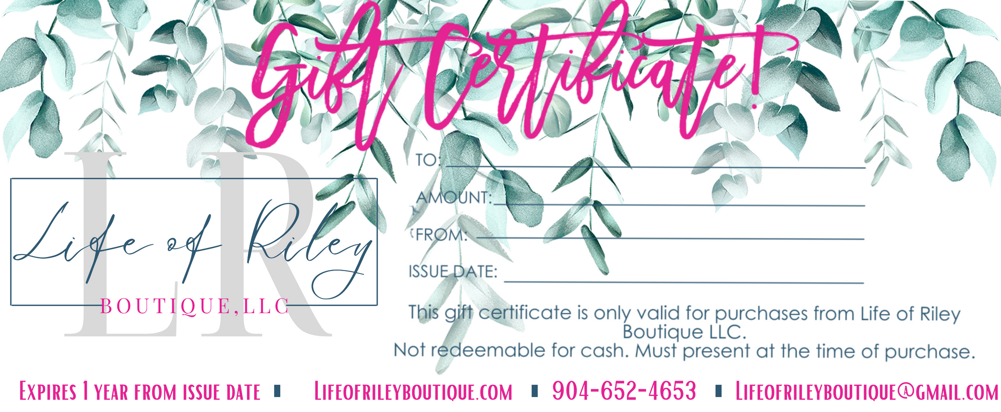 THIS GIFT CERIFCATE IS ONLY VALID FOR PURCHASES FROM LIFE OF RILEY BOUTIQUE, LLC.
