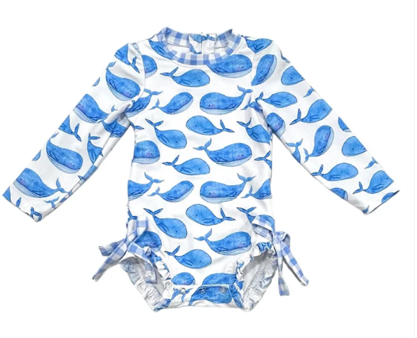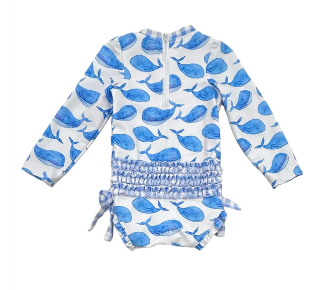 Make a splash with our adorable Ruffle Bottom Swimsuit featuring charming whales! Perfect for your little girl's next beach adventure, this swimsuit combines playful style with comfort and functionality. Get ready for some fin-tastic fun in the sun!