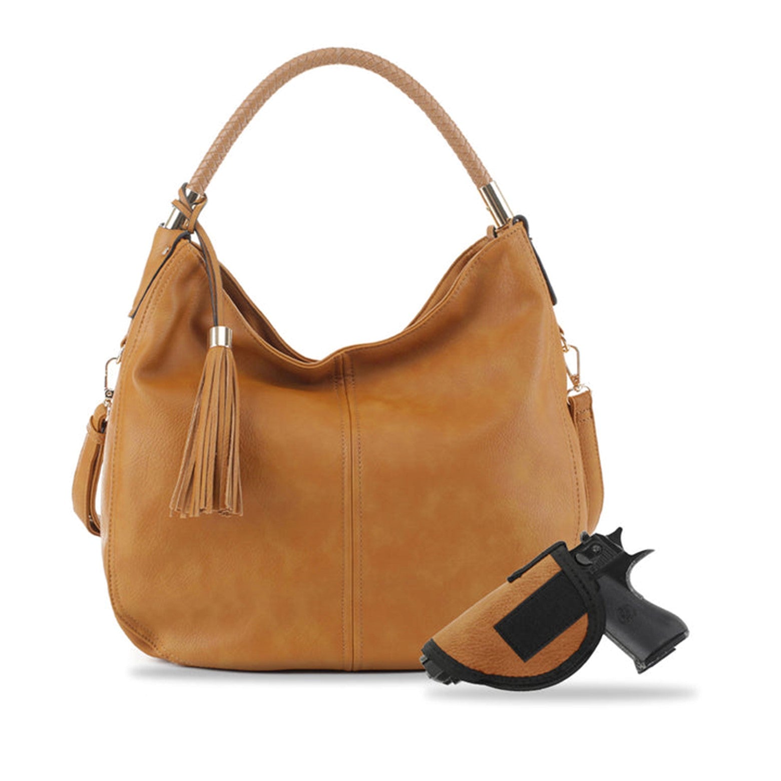 SIENNA CONCEALED CARRY LOCK AND KEY TASSEL HOBO SHOULDER BAG- COGNAC